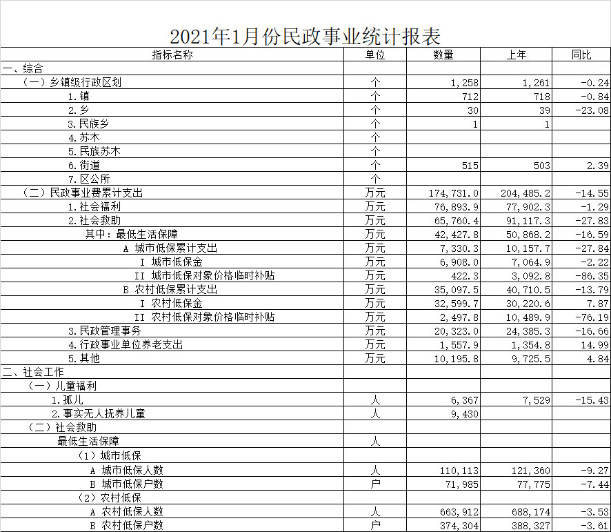 2021年1月份民政事业统计报表